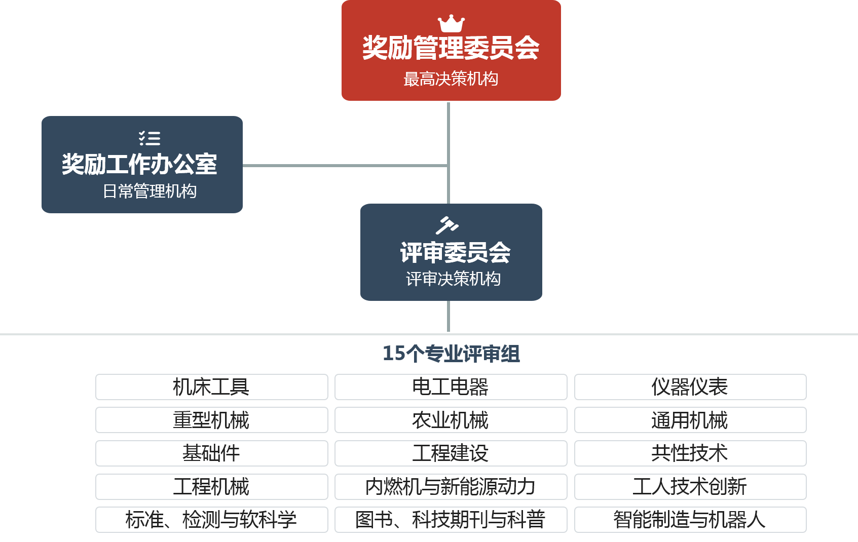 机械工业科学技术奖的组织机构由管理机构、评审机构和办事机构组成,具体如下图所示: