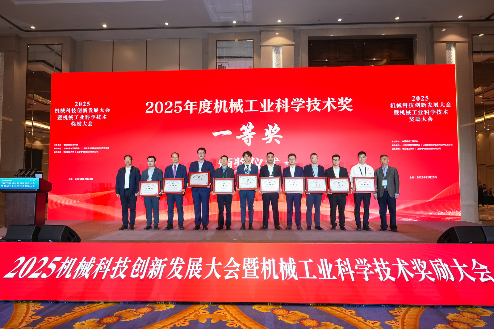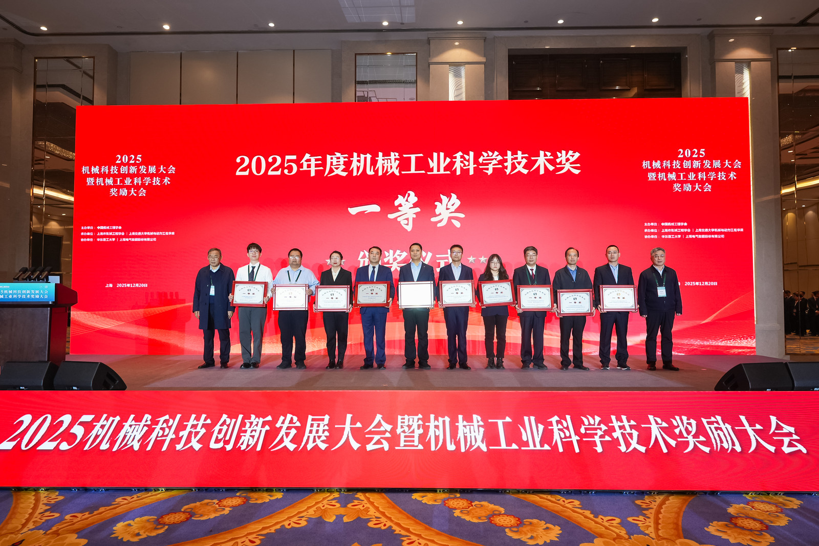 2025年12月20日,2025年度机械工业科学技术奖在上海召开的“2025机械科技创新发展大会暨机械工业科学技术奖励大会”上举行了隆重的颁奖仪式。本次会议由机械奖共同设奖方中国机械工程学会主办。中国机械工程学会理事长林忠钦、监事长郭东明;中国机械工业联合会党委常委、副会长、机械工业科学技术奖管理委员会副主任罗俊杰;中国机械工程学会副理事长王国彪、王德成、尤政、邓宗全、杨华勇、陈学东、黄庆学,秘书长张喜军,监事杜兵,中国机械工程学会原副理事长、机械工业科学技术奖管理委员会副主任陆大明;上海市科协党组成员、专职副主席石谦,上海交通大学常务副校长奚立峰,机械工业科学技术奖励工作办公室副主任牛芳等领导,以及机械领域的院士专家、行业精英、青年学者及企业代表共600余人参加了大会。